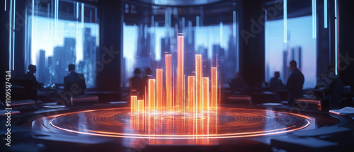 high resolution image of holographic financial display in modern office setting, showcasing vibrant orange bars representing data analysis. futuristic atmosphere evokes innovation and technology