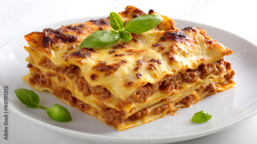 High Resolution Image of Traditional Italian Lasagna on White Plate with Basil Garnish and Melted Cheese