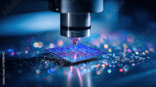 High resolution macro shot of laser engraving machine working microchip, showcasing intricate details and vibrant colors. scene captures precision and technology involved modern manufacturing