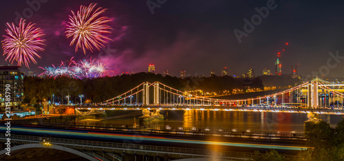 High Resolution Panorama of the Chelsea Bridge in London from Battersea Park at night and the fireworks