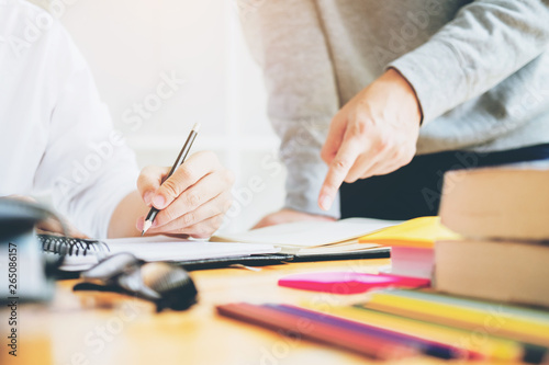 High school or college students studying and reading together in library