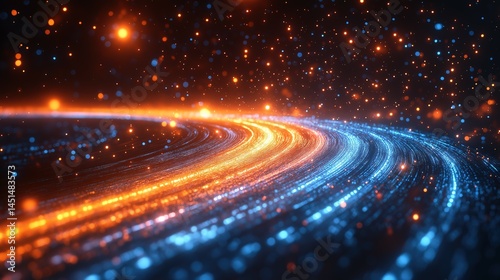 High speed light with blue and orange stripes in abstract, futuristic technological concept, showing motion blur against fast forward timeline background