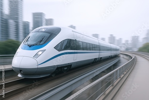 High Speed Modern Bullet Train Traveling on Elevated Track in Urban Cityscape.