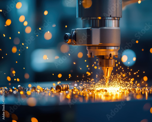High tech industrial machinery with robotic assistance creates sparks during metal processing. scene captures precision and energy of modern manufacturing