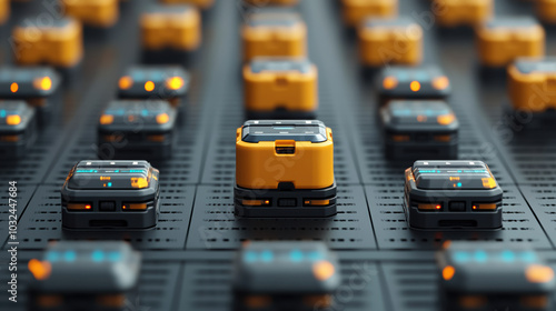 High tech warehouse with automated robots and pallets, showcasing innovation