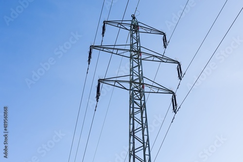 High voltage columns, in the background with blue sky and clouds. Prices of electricity, consumption, ecology.
