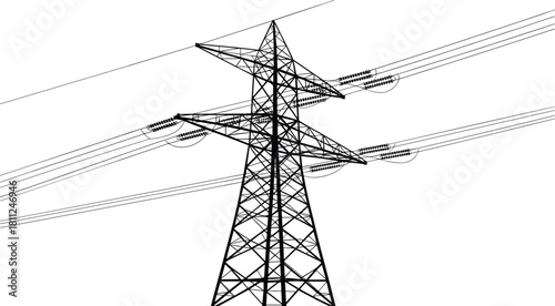 High voltage electric transmission tower vector illustration, blue line wireframe sketch of power pylon, industrial energy infrastructure concept for engineering design,