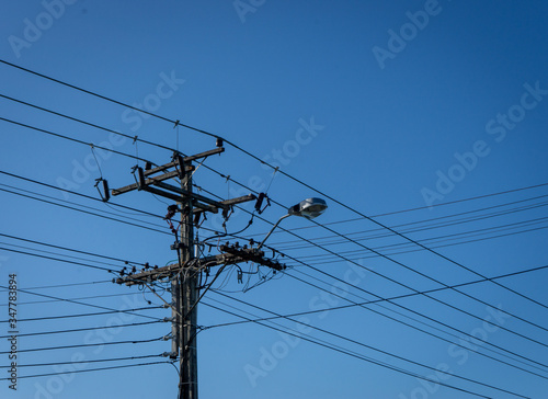 High voltage power lines with a street light