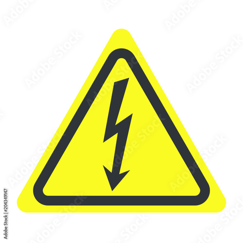 High Voltage Sign. Danger symbol. Black arrow isolated in yellow triangle on white background. Warning icon. Vector illustration