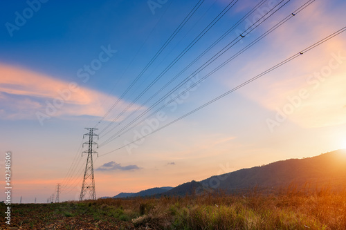 High Voltage transmission tower at twilight time.