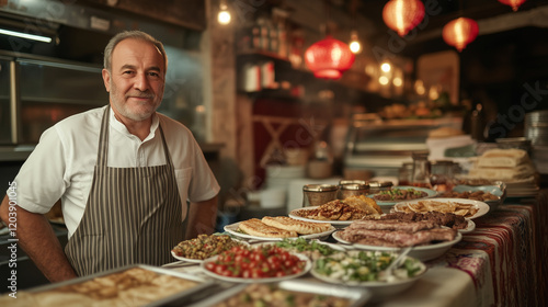 High-angle capture of a vibrant Ramadan feast, including Turkish dishes such as pide bread, lamb kebabs, meze platters, baklava, and tea served in glass cups.