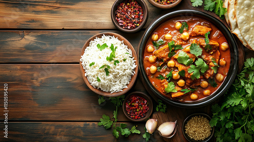 High-angle view of chickpea curry with basmati rice, garnished with herbs, rustic and comforting vibe