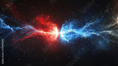 High-contrast vector scene of two glowing particles colliding at the center, one red and one blue, sending radial energy waves and fractal sparks across a pitch-black field