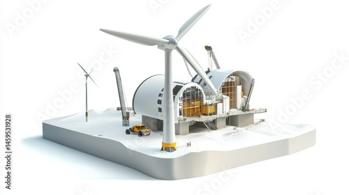 High-detail 3D visualization of cold-region wind farm with snow drift control, heated turbine bases, wildlife deterrent systems, and low-noise blades, white background