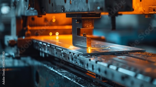 High-detail close-up of stainless steel being formed by a press brake tool, under the harsh lights of an industrial steel factory