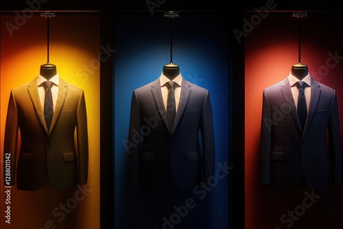 High-end boutique display of tailored clothing featuring elegant suits in a fashionable showroom environment