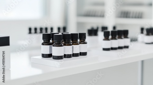High-End Olfactory Assessment Tools Collection Diverse Range of Essential Oils in Amber Glass Bottles with Blank Labels Displayed on a Modern White Shelf