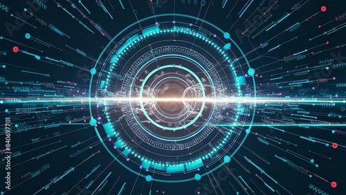 High-Energy Digital Illustration of Futuristic Cybernetic Tunnel with Central Circular Interface and Radial Lines in Blue and Red