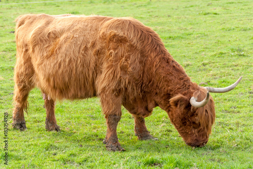 Highland Cattle Cow Grazing in a Summer Alpine meadow