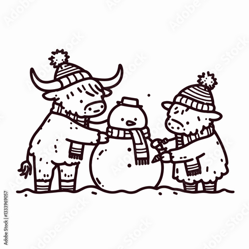 Highland Cow Couple Building a snowman; a simple monochrome vector graphic depicts their winter fun.