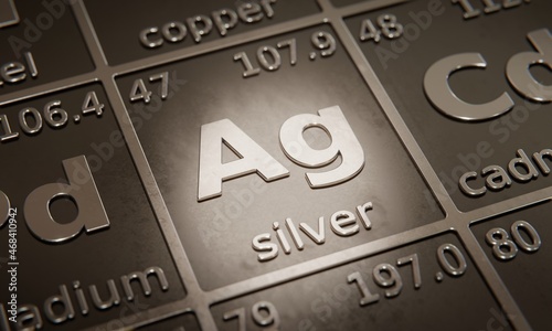 Highlight on chemical element Silver in periodic table of elements. 3D rendering