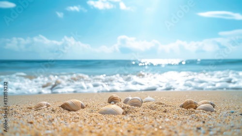 Highlight the natural beauty of coastal landscapes with an image showcasing an empty sand beach strewn with shells, set against the serene backdrop of a summer sea.