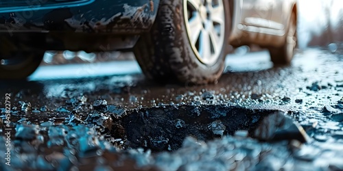 Highlighting Road Safety and Maintenance Close-up of Car Tire Near Pothole. Concept Road Safety, Maintenance Tips, Car Care, Pothole Awareness, Tire Inspection