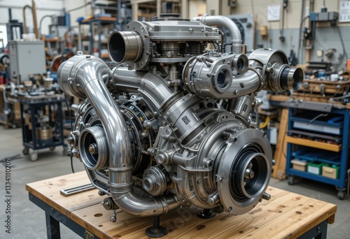 Highly Detailed Industrial Turbo Engine on Wooden Workbench