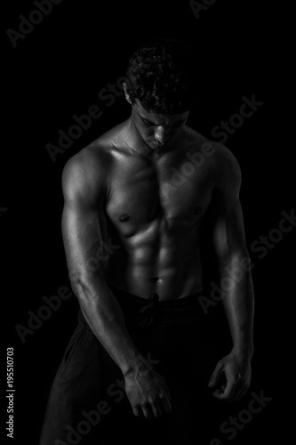 Highly retouched black and white fitness model and bodybuilder, Looking and posing abs and chest. concept of power, strength and self-confidence. black background.