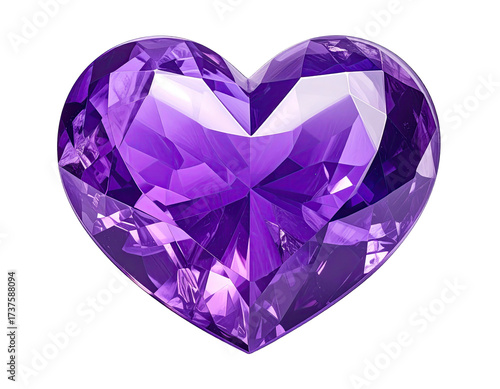 Highly-detailed, faceted, purple gemstone shaped like a heart, isolated on black