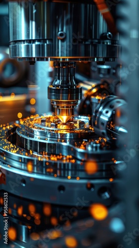 High-precision industrial machine tool with glowing sparks during metalworking process in a modern manufacturing facility