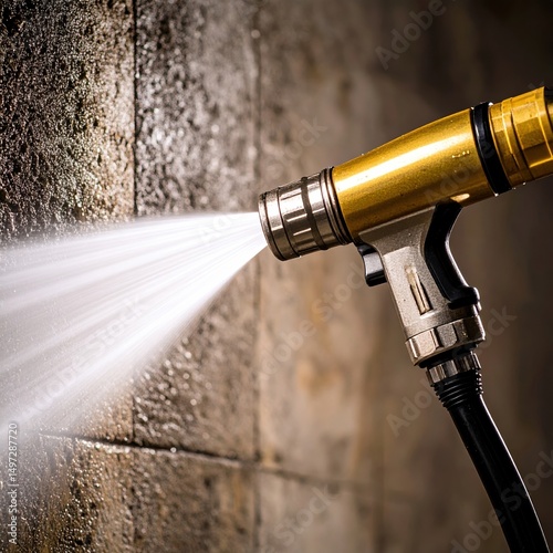 High-pressure water spray from metal hose nozzle on wet stone wall