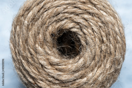 High-quality handmade coil made of natural hemp rope, isolated on a white background. Rustic beige cord made of eco material