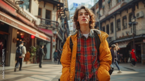 High-quality image of a non-binary person confidently striding through a bustling city square