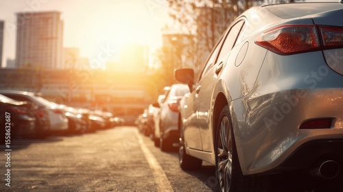 High-quality photo of car parked in an outdoor parking lot on a sunny day, Car insurance background, Used car for sale and rental service.
