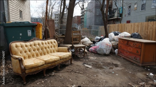 High-quality photo of urban backyard cluttered with furniture and trash bags.
