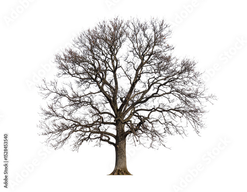 High-quality PNG image of a large deciduous tree with bare, frosted branches, isolated on a transparent background. The tree has no leaves and is covered with light frost or snow, symbolizing winter,