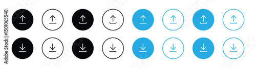 "High-Quality Upload and Download Icon Set – Modern Circular UI Buttons in Black, White, and Blue Color Variations"