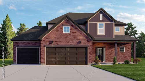 High-Resolution 3D Architectural Exterior Rendering of a Two-Story Red Brick Suburban House with Triple Garage, Covered Entry Porch, and Front Lawn – Realistic Visualization