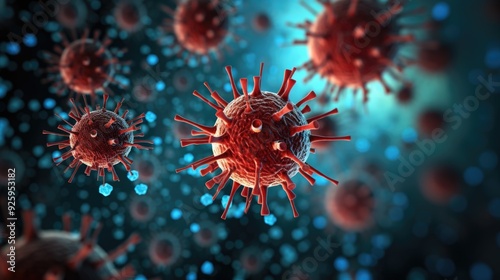 High-resolution 3D rendering of COVID-19 virus particles, emphasizing their complex morphology and interaction with host cells,generative ai