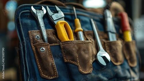 High-resolution close-up of a tool bag filled with hand