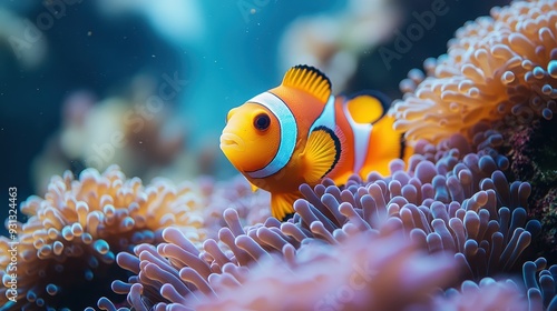High-Resolution Closeup of Clownfish Nestled in Anemone at the Sea Bottom - Detailed Underwater Photography