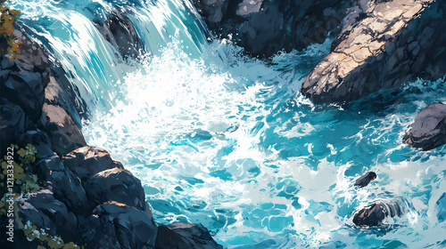 High-resolution image: cerulean and silver water cascade over rocky rapids in a turbulent river. Silver Cascade. Illustration