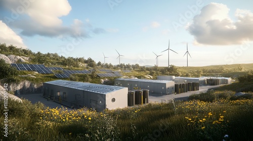 High-Resolution Modern Energy Storage Facility with Renewable Power Sources. AI generated illustration