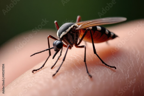 High-Resolution Mosquito on Human Hand Close-Up: Intricate Skin Texture, Vein Detail, Soft Lighting, Photoreal Macro Capture, Scientific Realism, Sharp Anatomy Focus