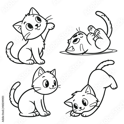 High-resolution outline illustrations of cute kittens playing, stretching, and jumping