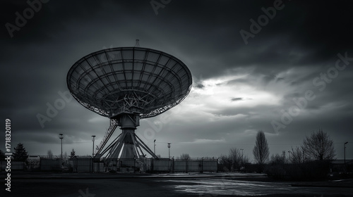 High-resolution satellite dish isolated on large gray space area background, showcasing metallic texture, precise curvature, and modern communication technology design.