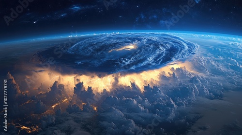 High-resolution satellite image of a severe thunderstorm with detailed cloud formations and active lightning, illustrating its power