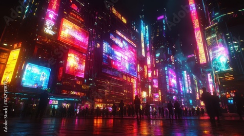 High-rise buildings with LED screens displaying the neon vibrant colors light waves in the night sky, people walking on the sidewalk below, modern architecture. cyberpunk art style. Cinematic.