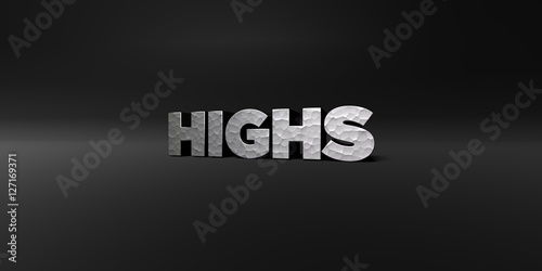 HIGHS - hammered metal finish text on black studio - 3D rendered royalty free stock photo. This image can be used for an online website banner ad or a print postcard.